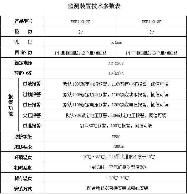 ESP100-2P/3P:可實(shí)時(shí)監(jiān)測(cè)電壓、電流、功率、電能和溫度等參量;具有過壓、欠壓、過載、過流、和超溫等多種報(bào)警功能;極數(shù)為2P/3P;標(biāo)配RS-485(MODBUS)通訊。